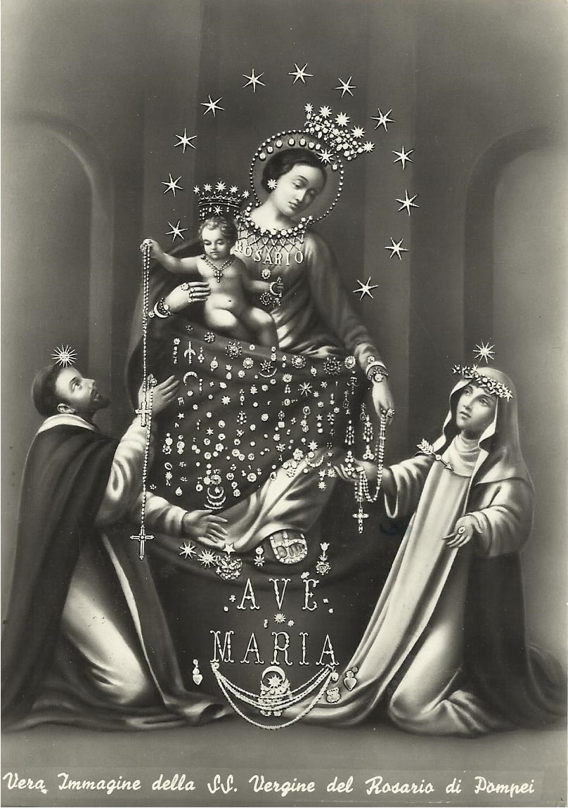 Esaudisci la preghiera che a Te rivolge fidente il Sommo Pontefice, acciocché tutti i popoli congiunti nell’unità della fede, conoscano ed amino Gesù Cristo, il benedetto frutto del seno tuo, che vive e regna nei secoli col Padre e con lo Spirito Santo. Ed allora tutti gli uomini ameranno anche Te, salute del mondo, arbitra dispensatrice dei tesori di Dio e Regina di misericordie nella Valle di Pompei. E glorificando Te, Regina delle Vittorie, che col Rosario disperdi ogni eresia, riconosceranno che a tutte le genti Tu dai la Vita, perché è d’uopo che si adempia la profezia del Vangelo: Tutte le genti mi chiameranno beata.